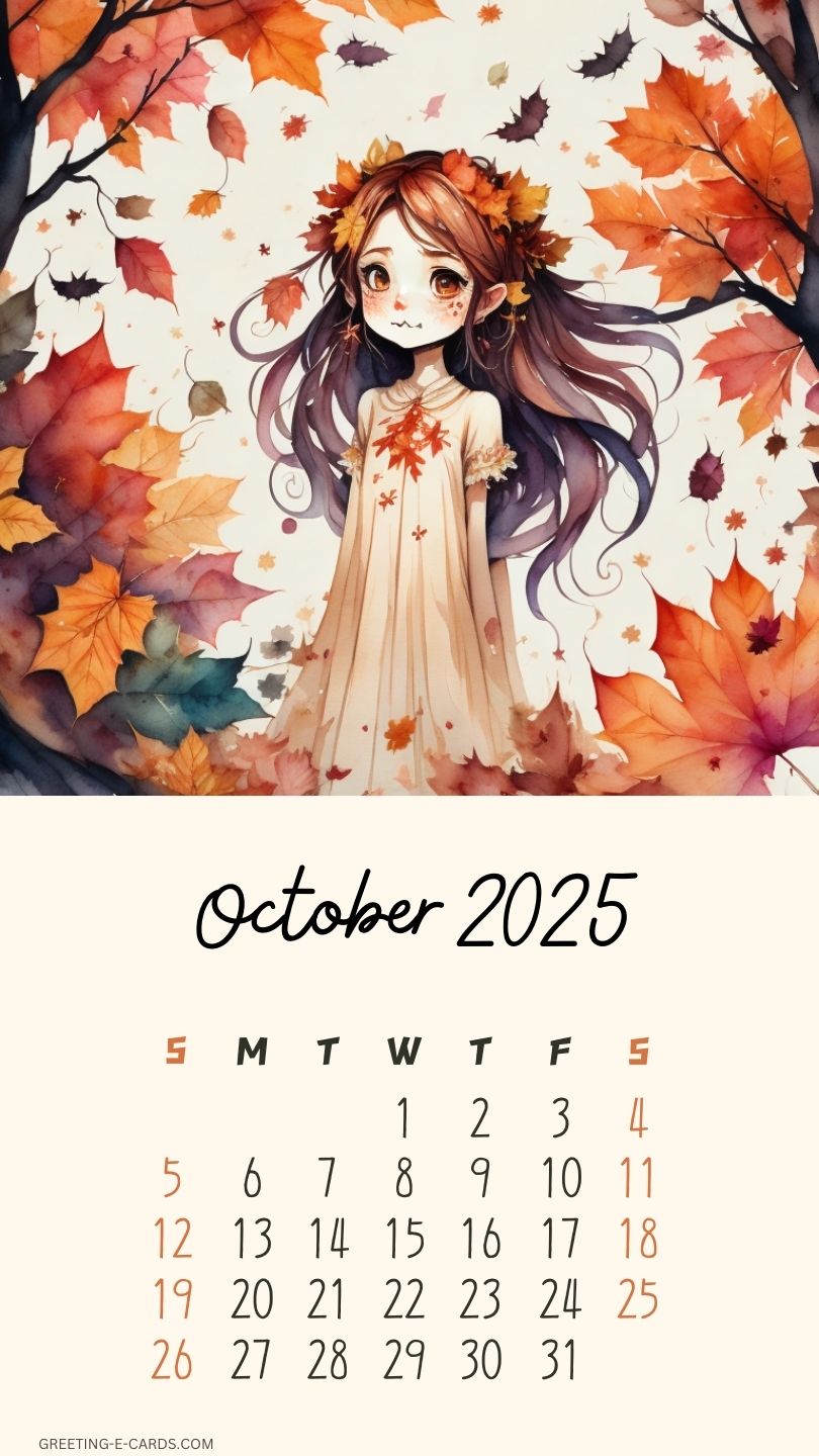 Cute Anime Girl October 2025 Calendar Phone Wallpaper