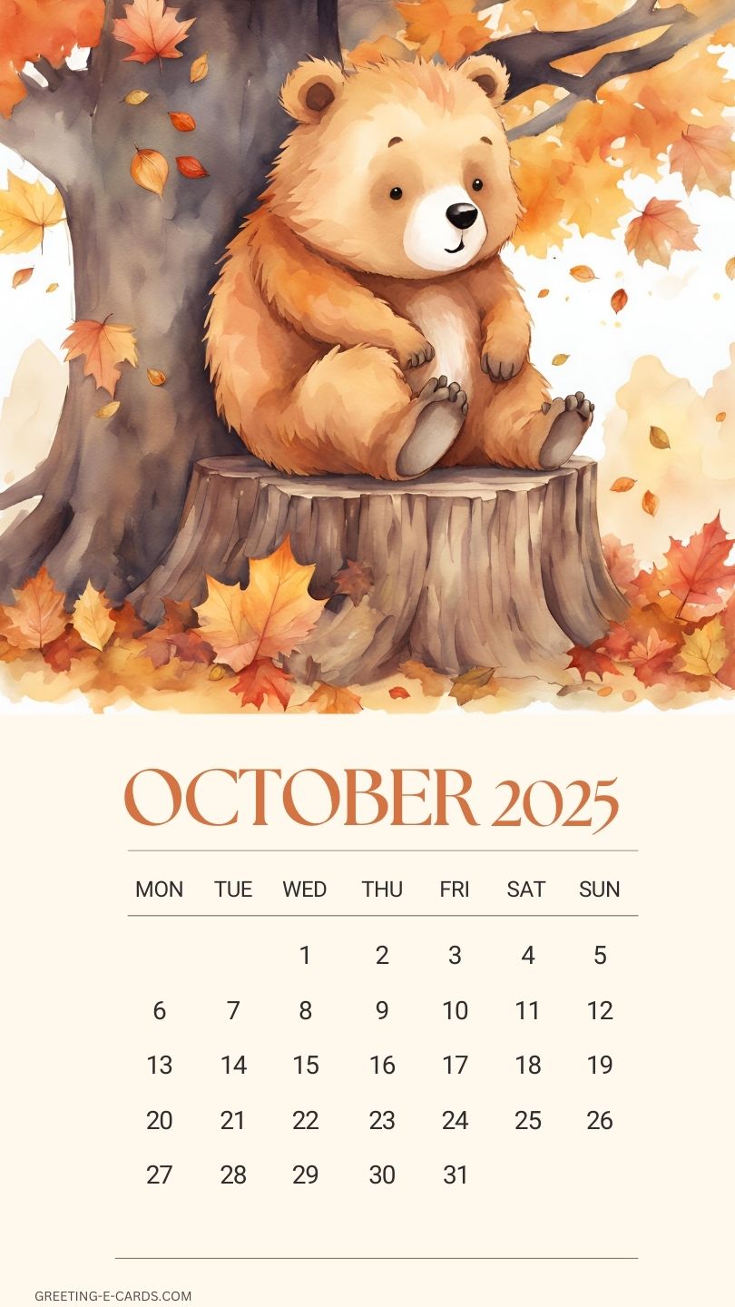 Cute Bear October 2025 Calendar Phone Wallpaper