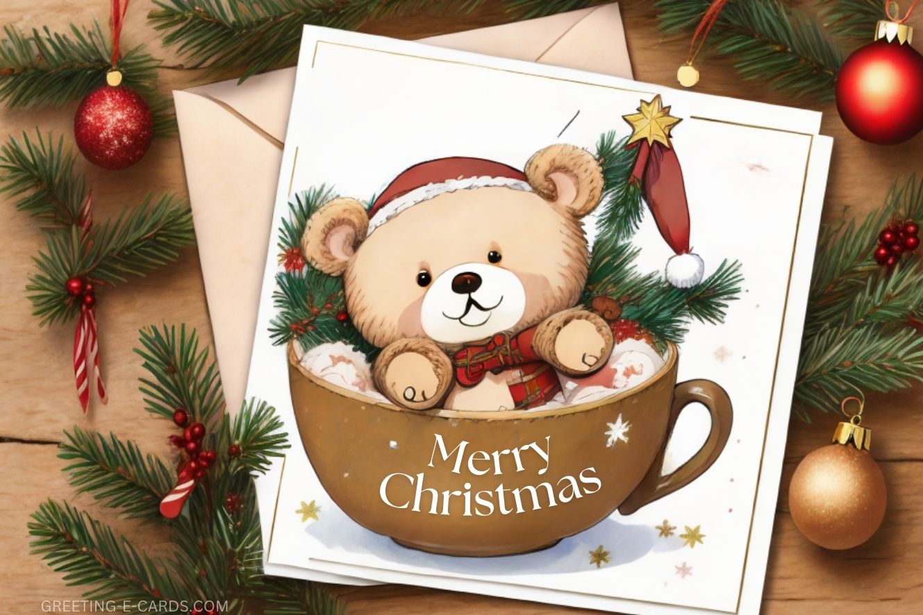 Send this cute Christmas e-card featuring a teddy bear in a mug to your loved ones this holiday season.