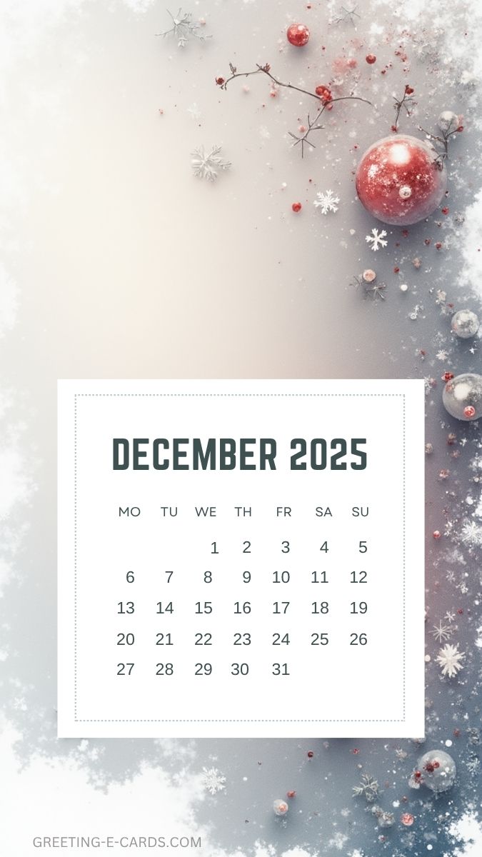 Download this free December calendar phone wallpaper with Christmas ornaments for your lockscreen.