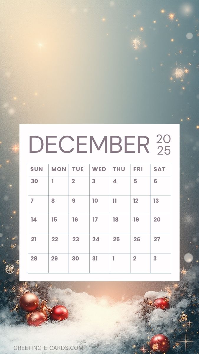 Download this free December calendar phone wallpaper with Christmas ornaments and a festive design for your lockscreen.