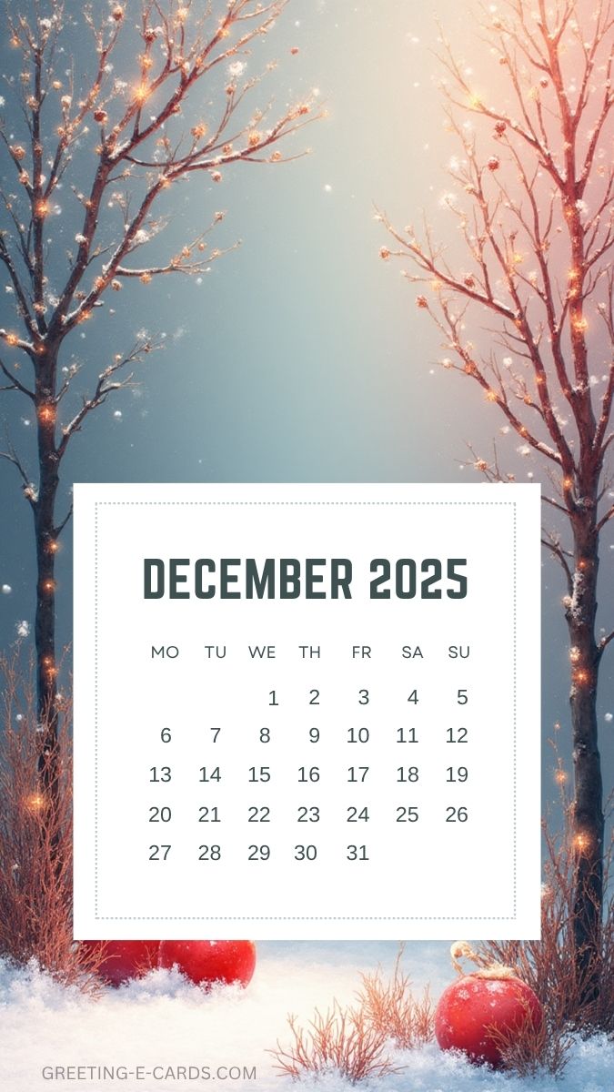 Get this free December 2025 calendar phone wallpaper with a beautiful winter nature scene for your lockscreen.