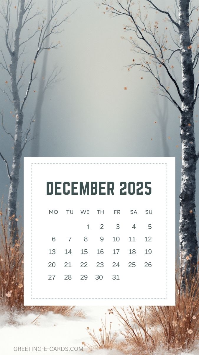 Download this free December 2025 calendar phone wallpaper featuring a serene winter scene for your lockscreen.