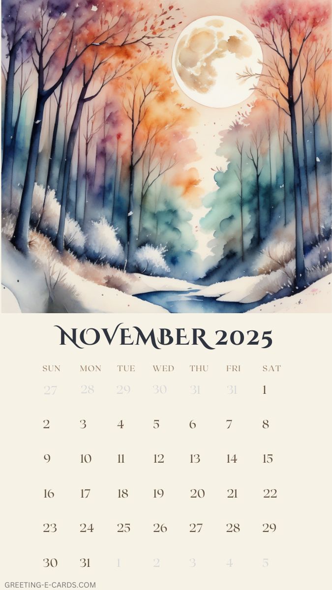 Download this free November 2025 calendar phone wallpaper featuring a beautiful nature scene for your lockscreen.