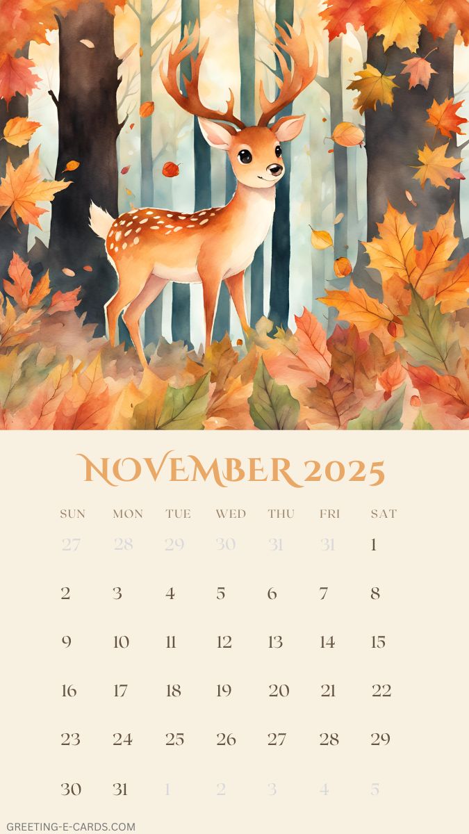 Get this free nature phone wallpaper with a cute deer and November 2025 calendar for your phone's lockscreen.