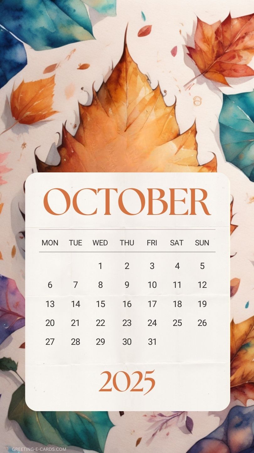 Download this beautiful October 2025 calendar phone wallpaper with watercolor leaves for your phone background.