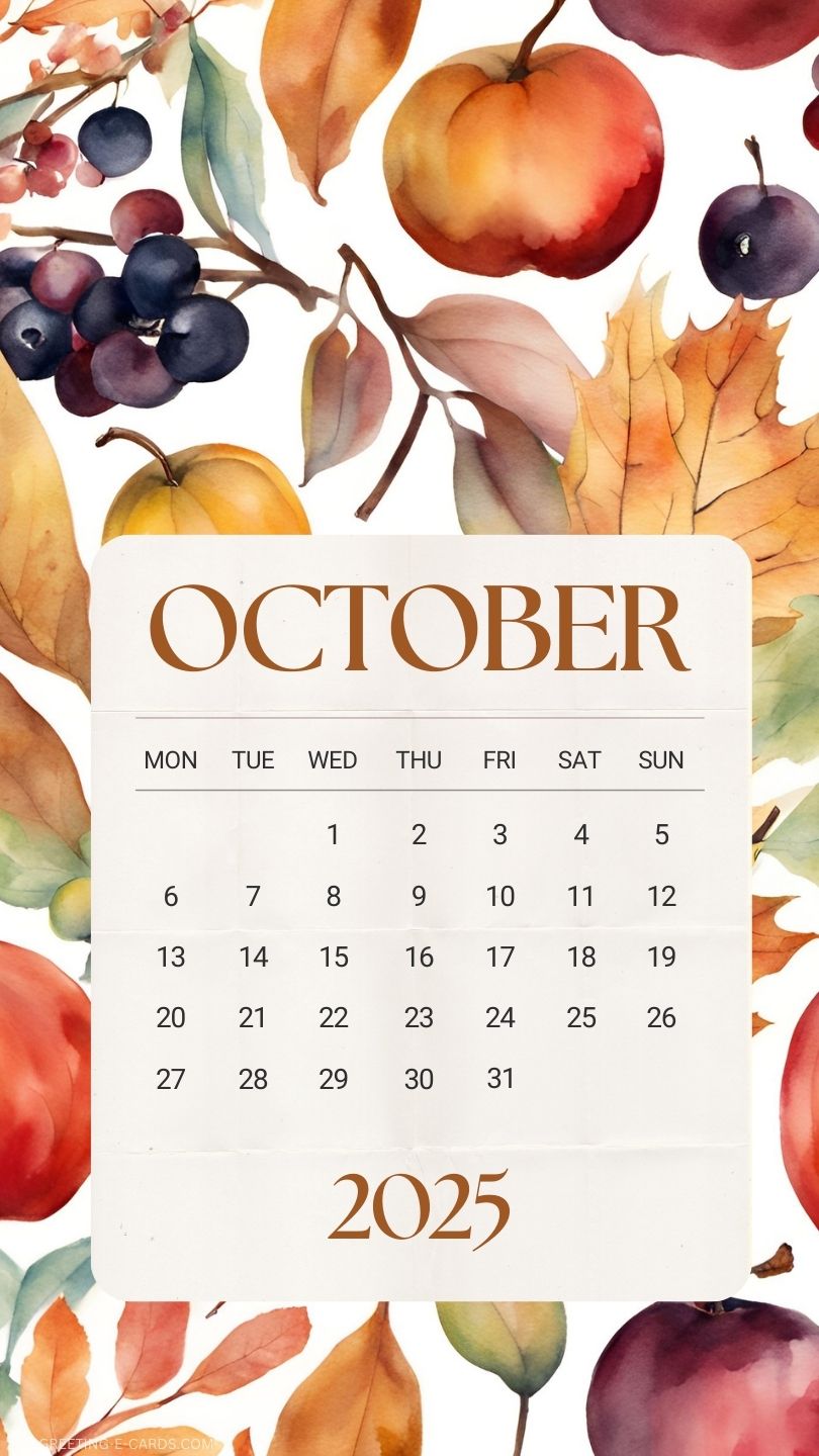 Download this beautiful October 2025 calendar phone wallpaper featuring watercolor apples and leaves.